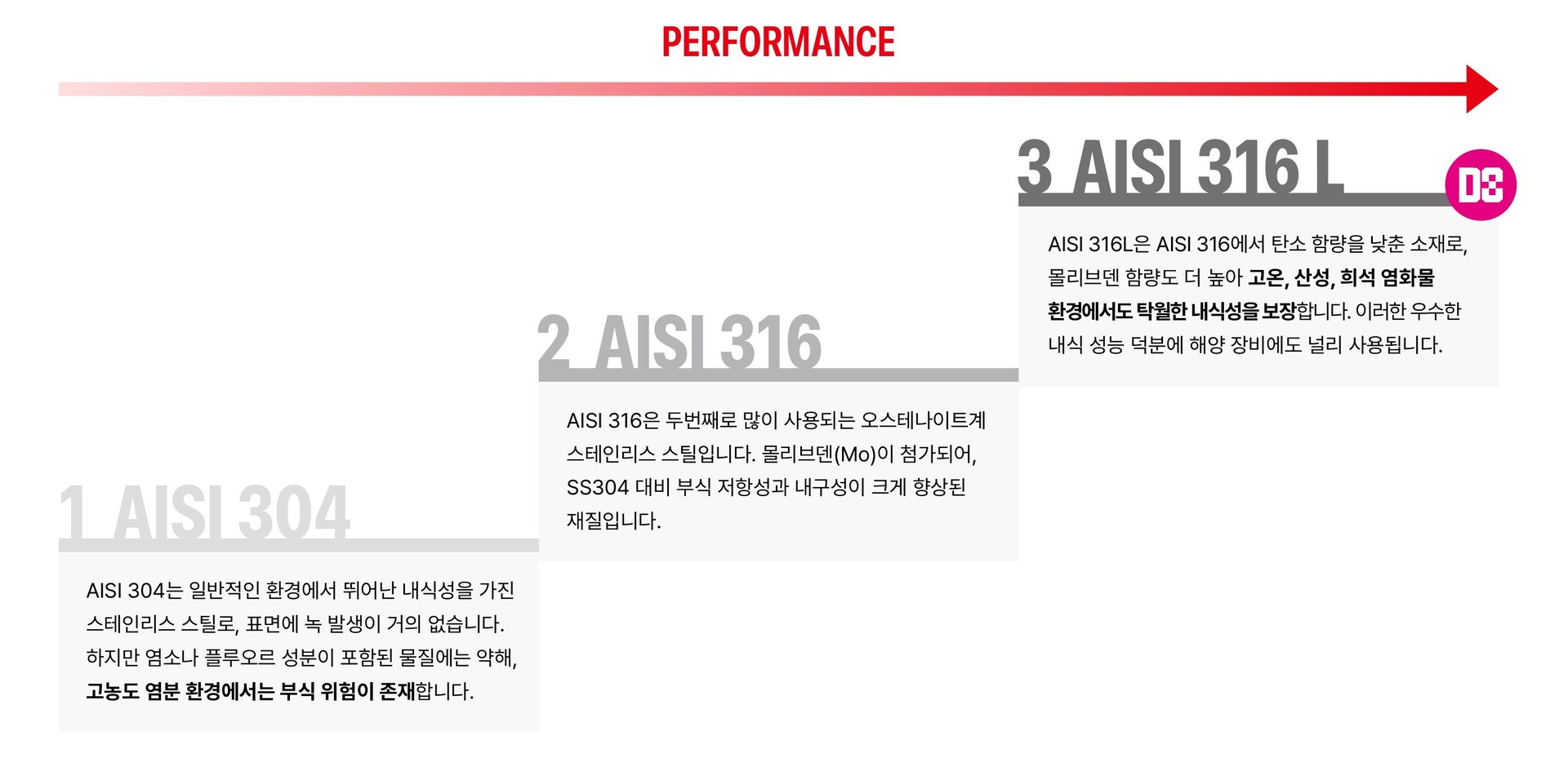 AISI 316L은 탁월한 내식성을 가지고 있어 수명을 연장시킵니다. 특히, 고온 환경에서의 염화물에 대해 뛰어난 부식 저항성을 보여, 수명을 증가시킵니다. |